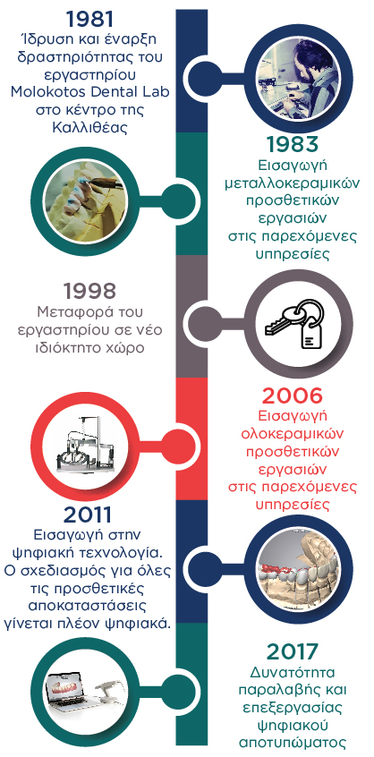 Το 1979, στην ηλικία των 21 ετών, ο Κωνσταντίνος Μολοκότος ξεκίνησε την καριέρα του ως οδοντοτεχνίτης στην Αθήνα. Τροφοδοτούμενος από την αγάπη του για το επάγγελμα, άνοιξε το οδοντοτεχνικό εργαστήριο Molokotos Dental Lab το 1981. “Η σκληρή δουλειά”, μας λέει, είναι αυτό που θα σας ανοίξει τις πόρτες.